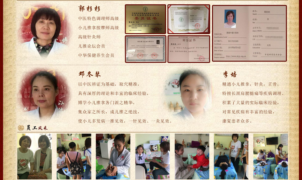 中医特色调理师高级、小儿推拿按摩师高级、高级针灸师、儿推论坛会员、中华保健养生会员。